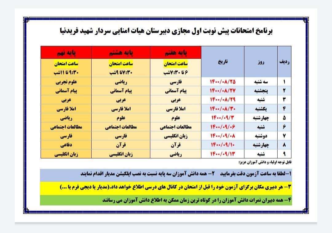 برنامه امتحانات پیش نوبت اول سه پایه
