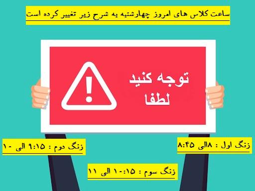 به دلیل برگزاری جلسه دبیران ساعات کلاس های امروز تغییر کرده است
